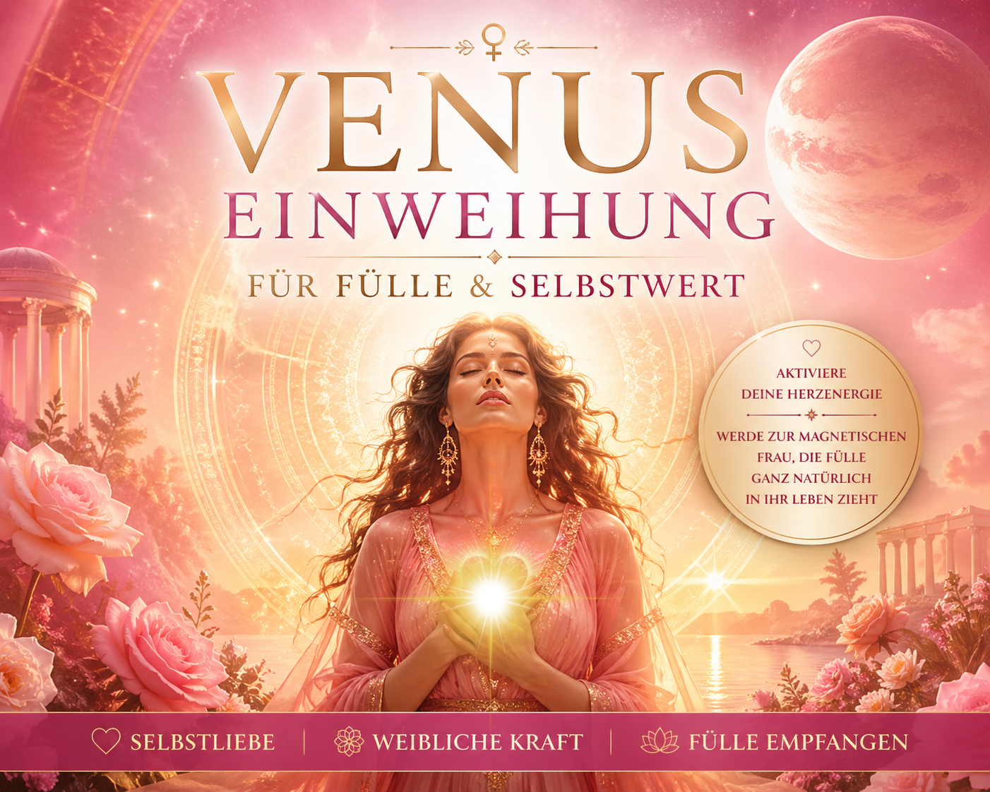 Erlebe eine kraftvolle Venus Einweihung, öffne dein Herz, stärke deinen Selbstwert und aktiviere deine Empfangsenergie. Werde zur magnetischen Frau und ziehe Fülle, Liebe und Leichtigkeit ganz natürlich in dein Leben.